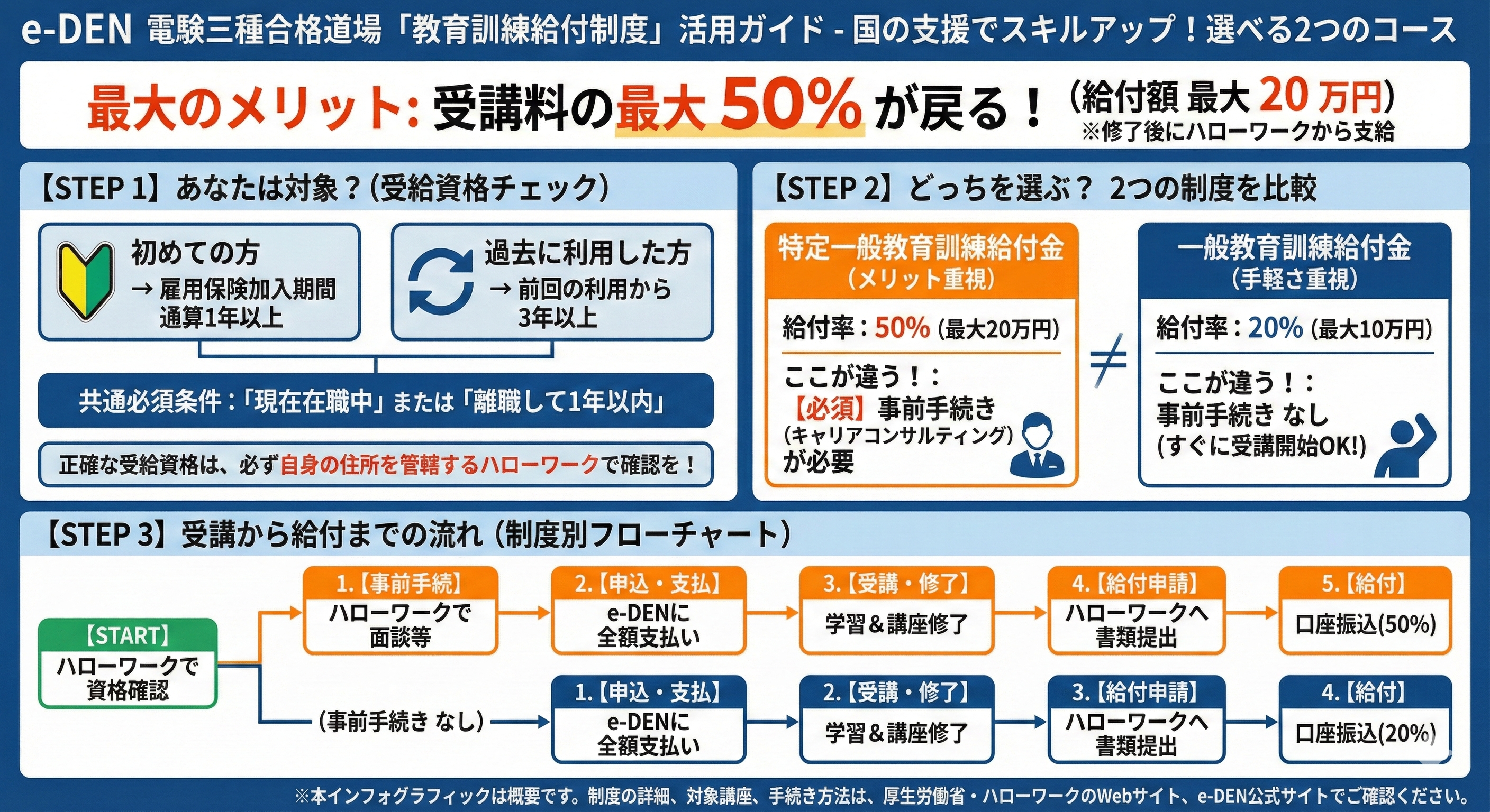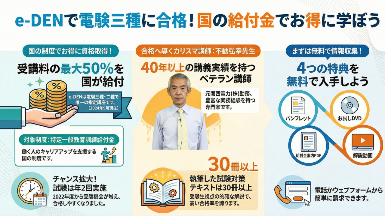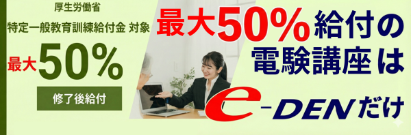 2024年10月1日現在、特定一般教育訓練給付金対象講座では、電験三種・電験二種の講座で全国唯一、e-DENの「電験三種合格道場」と「電験二種完全攻略ToKoToN 講座」が厚生労働省の講座指定を受けています。