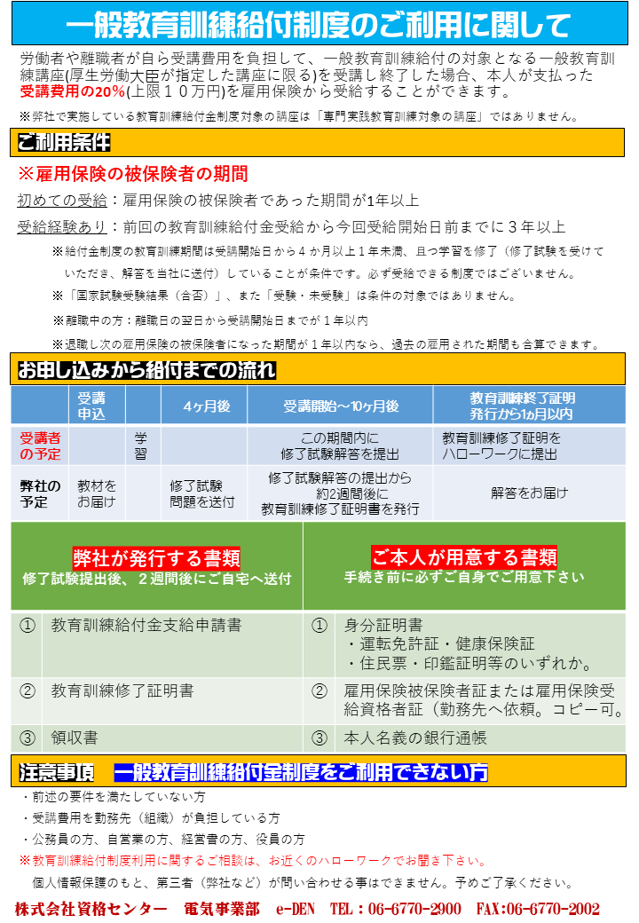 | 電話/FAX/E-Mail | TEL:06-6770-2900/FAX 06-6770-2002 e-mail: denki@shikakucenter.com |