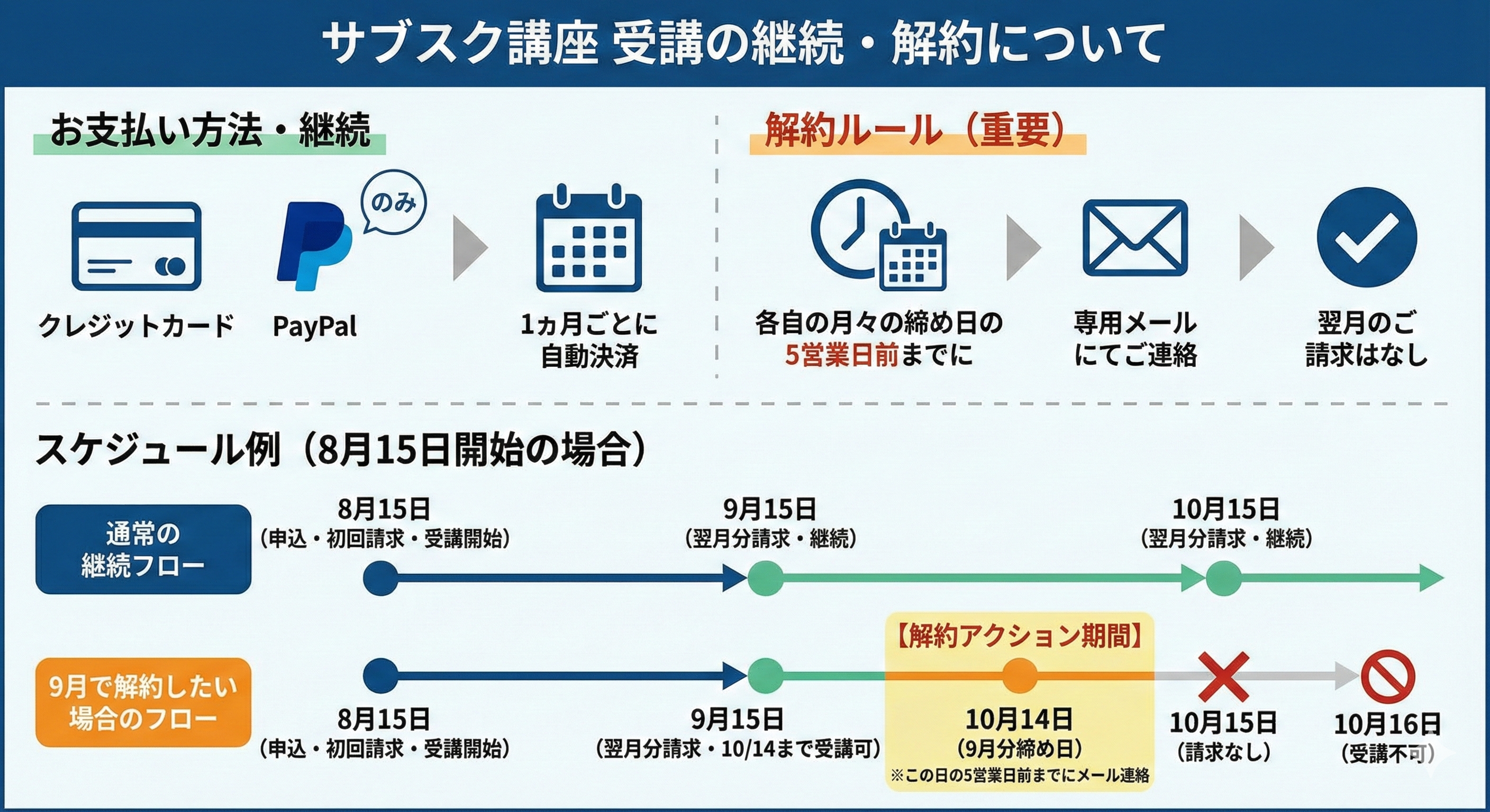 「オンライン講座」はじっくり取り組む長期契約、「サブスク講座」は月々払いで柔軟に利用したい方向けです。内容はどちらも高品質なDVD同等講義です。